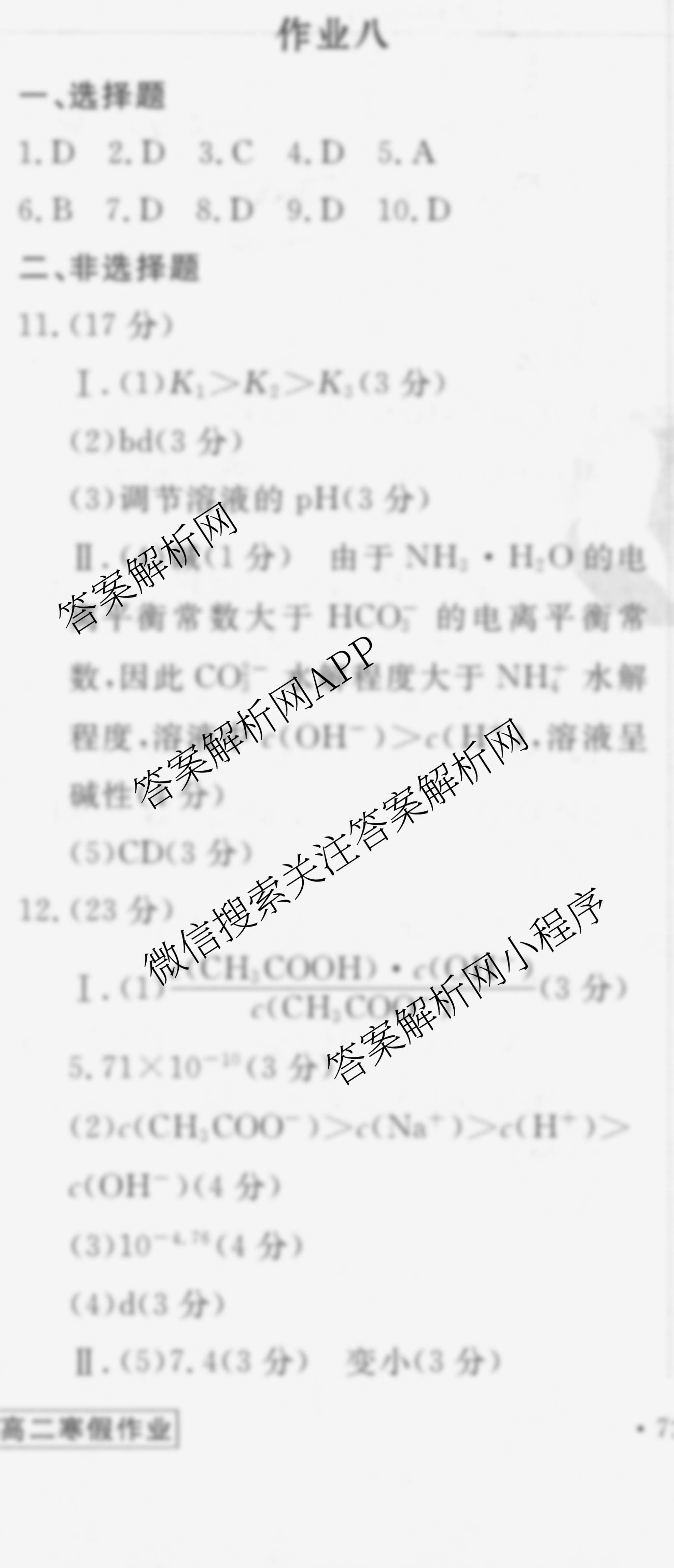 衡水金卷先享题2024-2025学年度高二寒假作业 化学 作业八答案