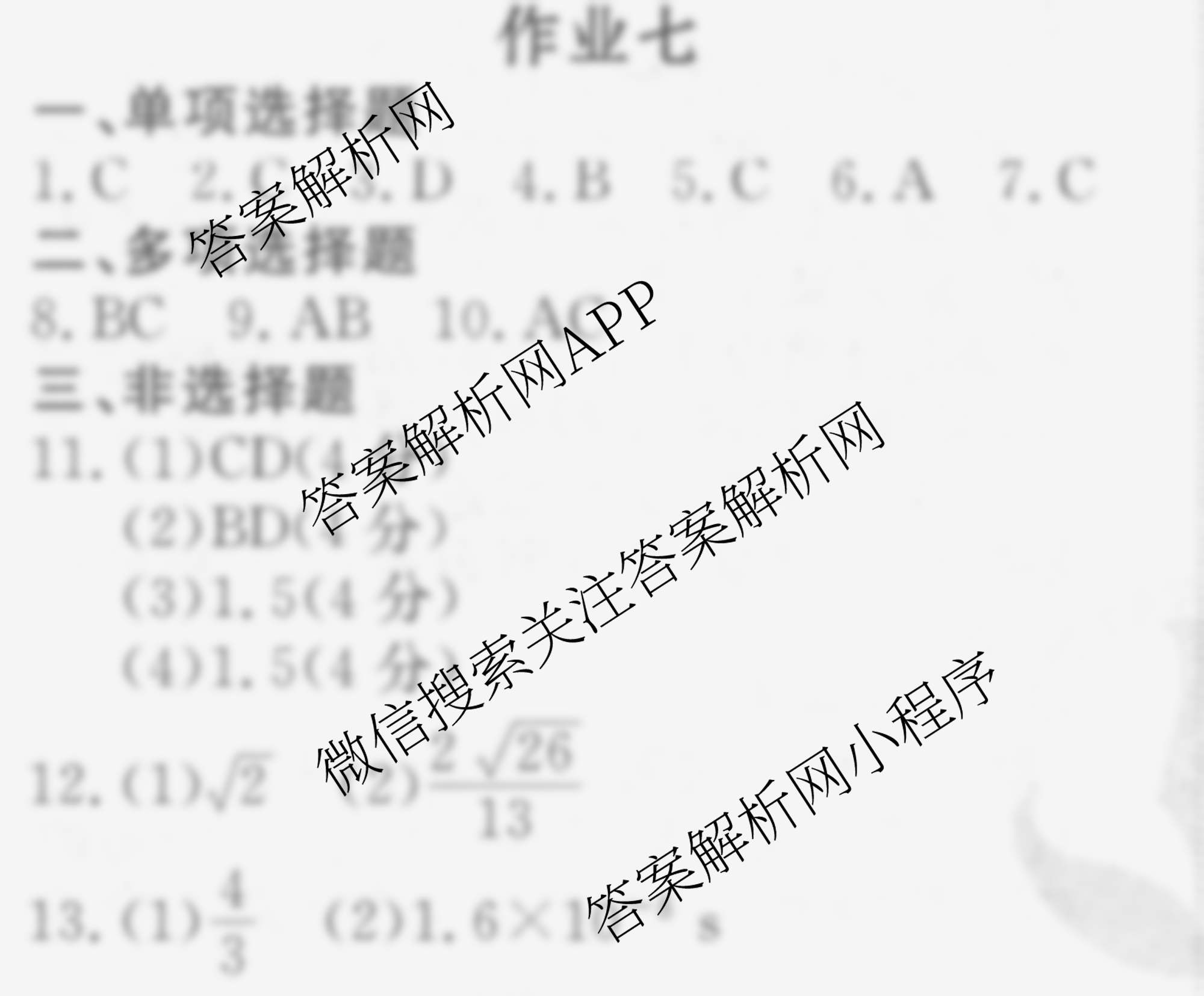 衡水金卷先享题2024-2025学年度高二寒假作业 物理 作业七答案