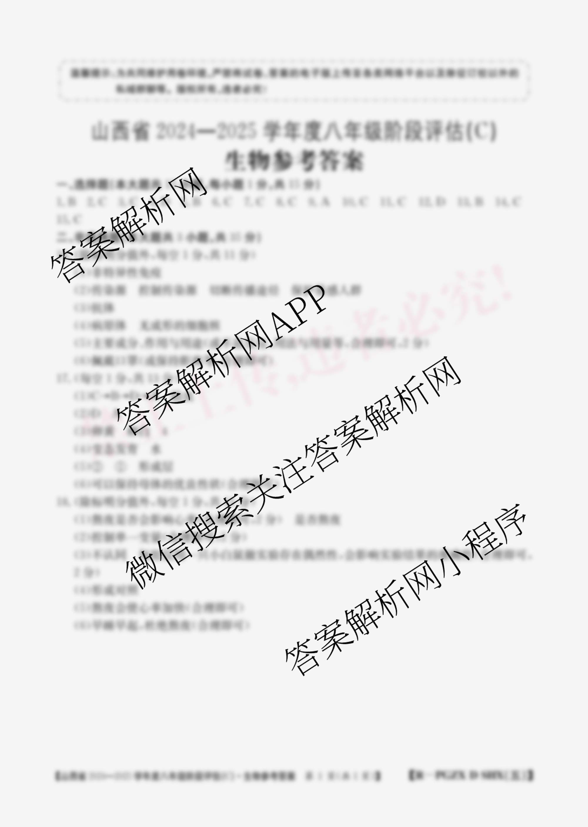 山西省2024~2025学年度八年级阶段评估(C)[PGZX D SHX(五)]生物(R)答案,目前学英语报答案已经汇总了山西省2024~2025学年度八年级阶段评估(C)[PGZX D SHX(五)]生物(R)答案的各科答案和试卷,获取更多初中阶段诊断答案解析,请在关注本站。