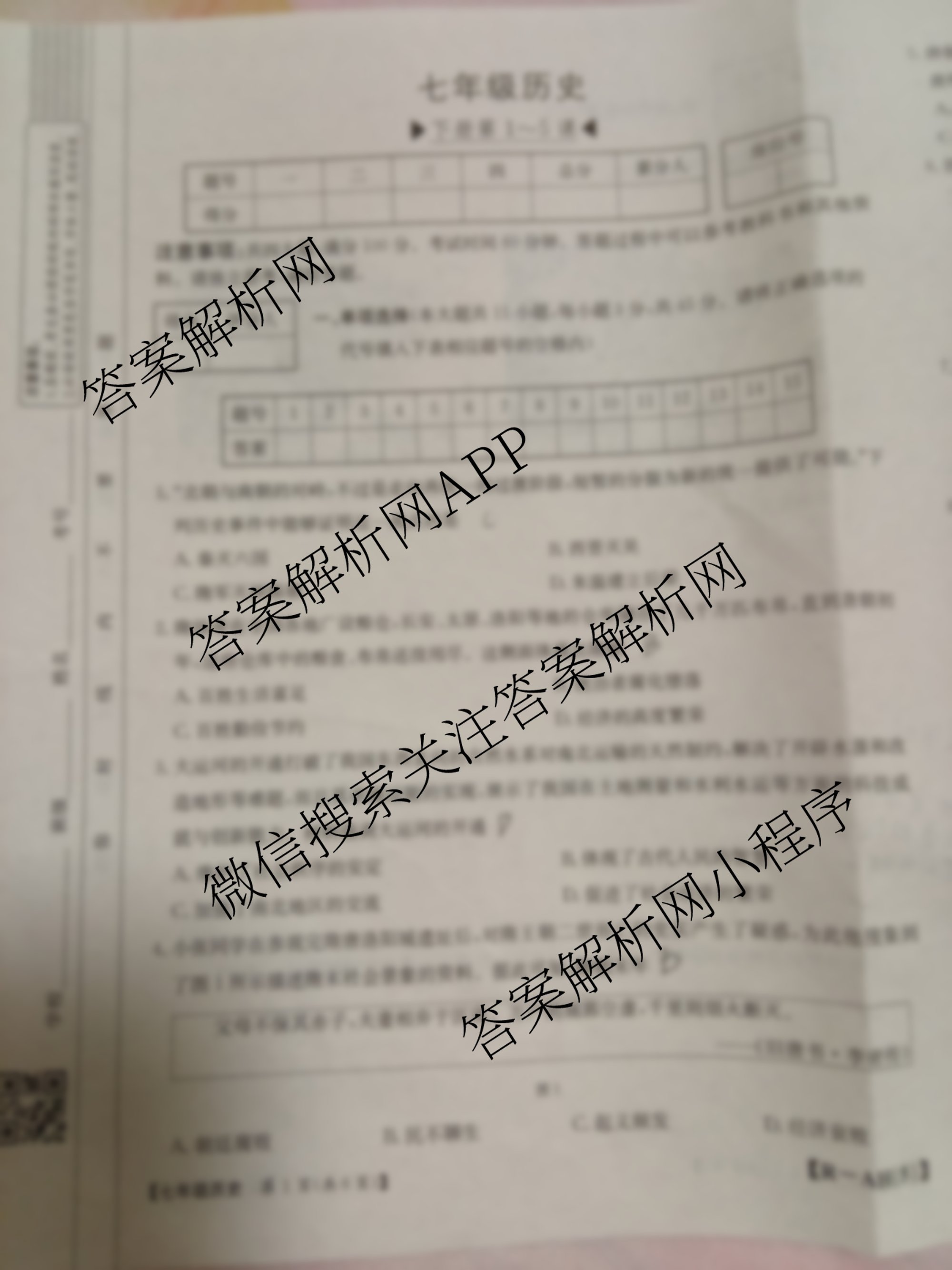 安徽省2024-2025七年级阶段评估[AH(5)]历史(R)试题,目前学英语报答案已经汇总了安徽省2024-2025七年级阶段评估[AH(5)]历史(R)试题的各科答案和试卷,获取更多初中阶段诊断答案解析,请在关注本站。