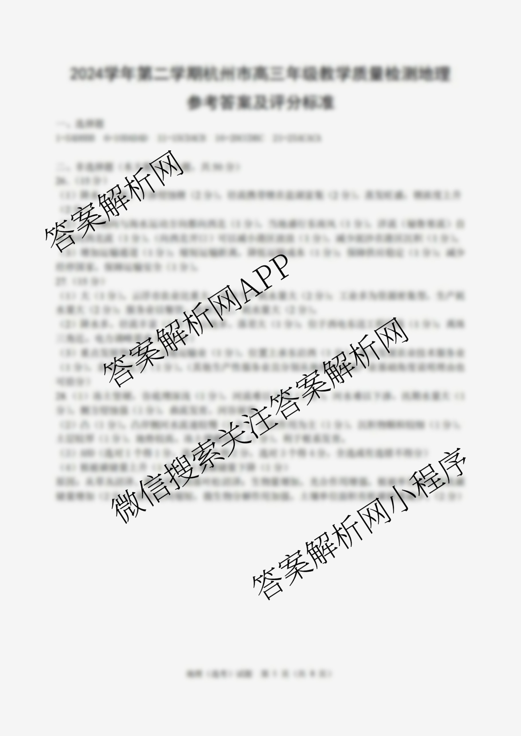 - (高三)2024学年第二学期杭州市年级[教学质量检测](杭州二模)地理答案