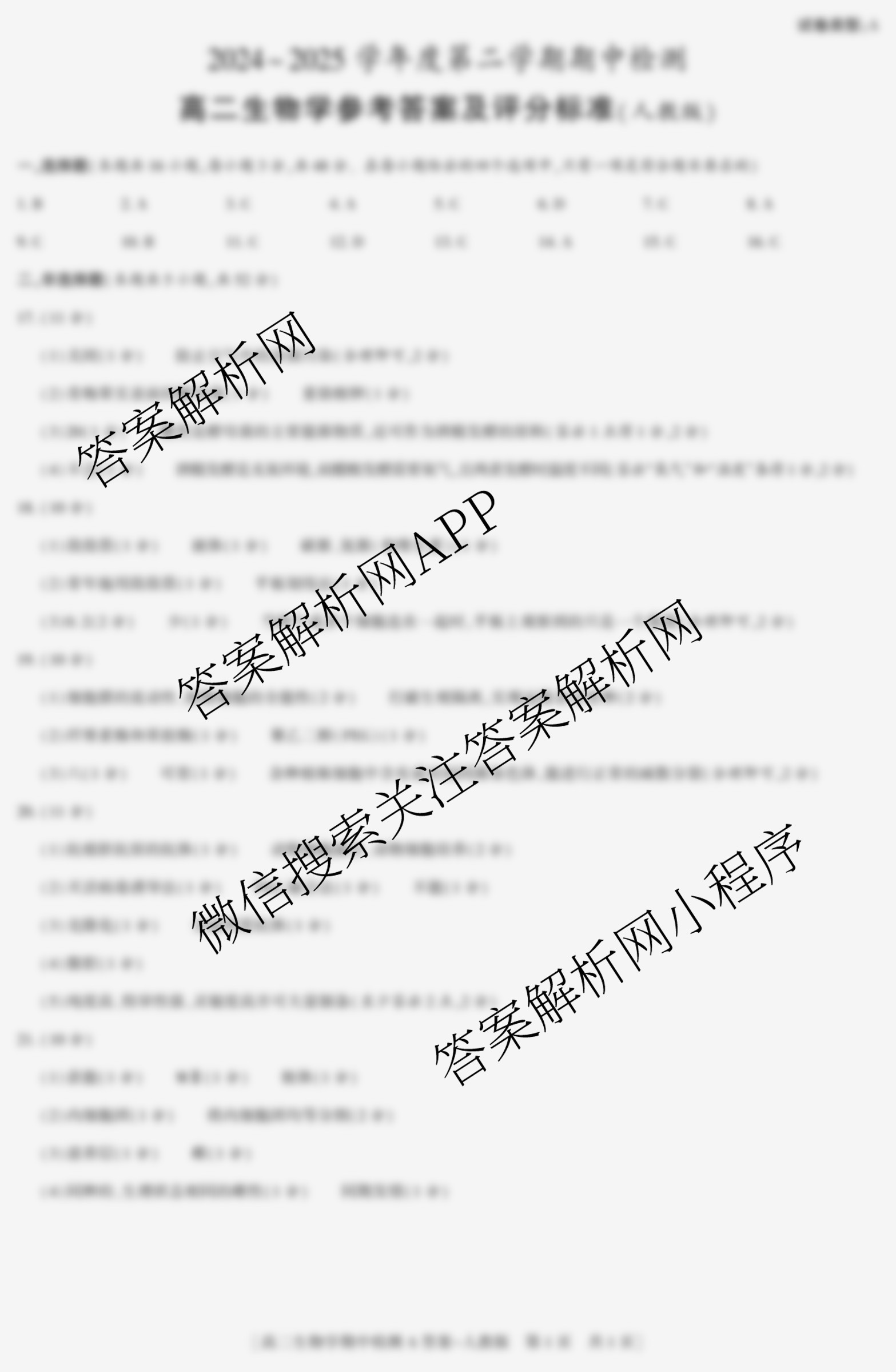 - (益卷)陕西省2024~2025学年度高二第二学期期中检测(试卷类型:A)生物(人教版)答案