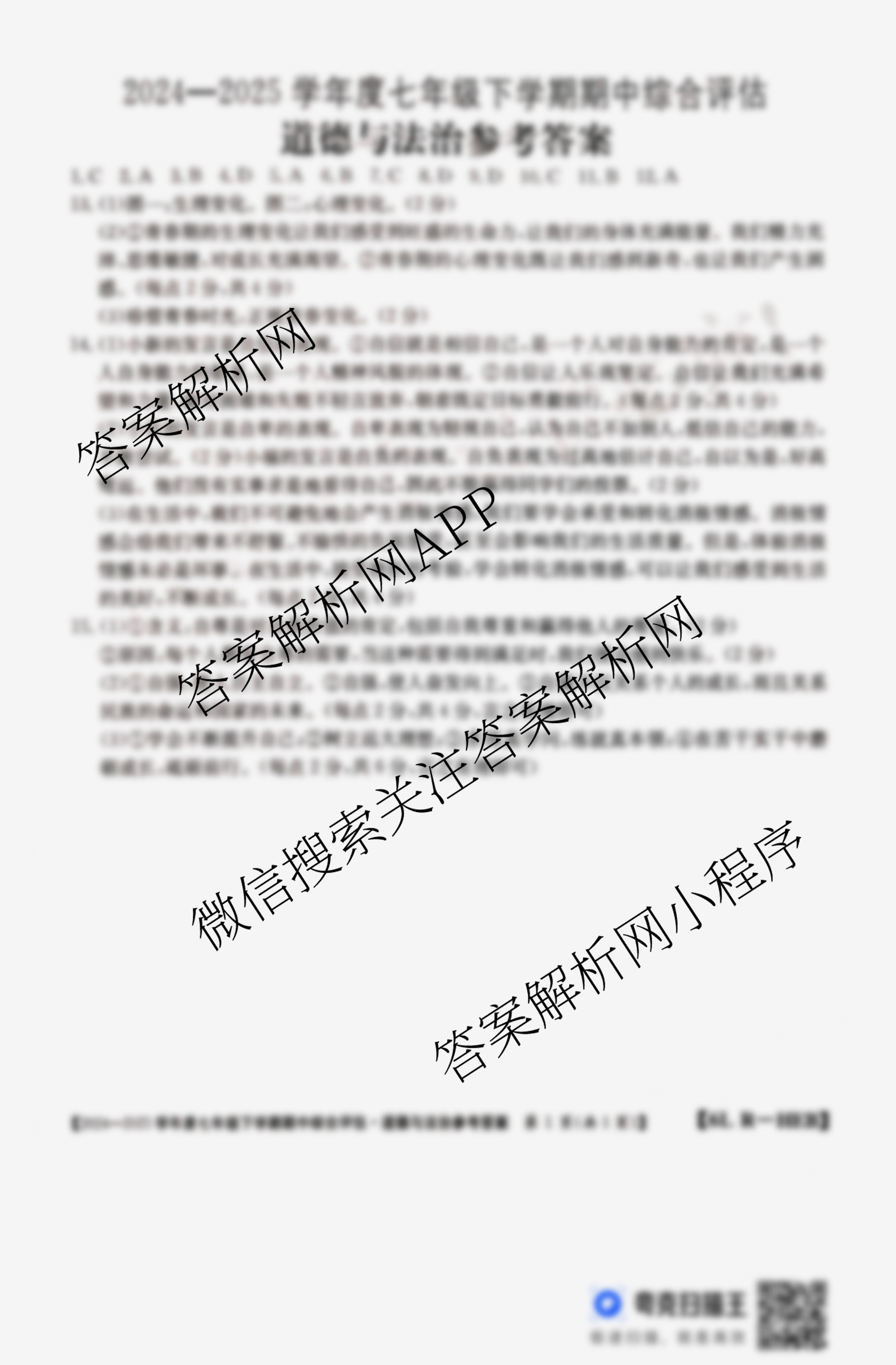 - 河北省2024~2025学年度[七年级]下学期期中综合评估[6L-HEB]道德与法治(R)答案