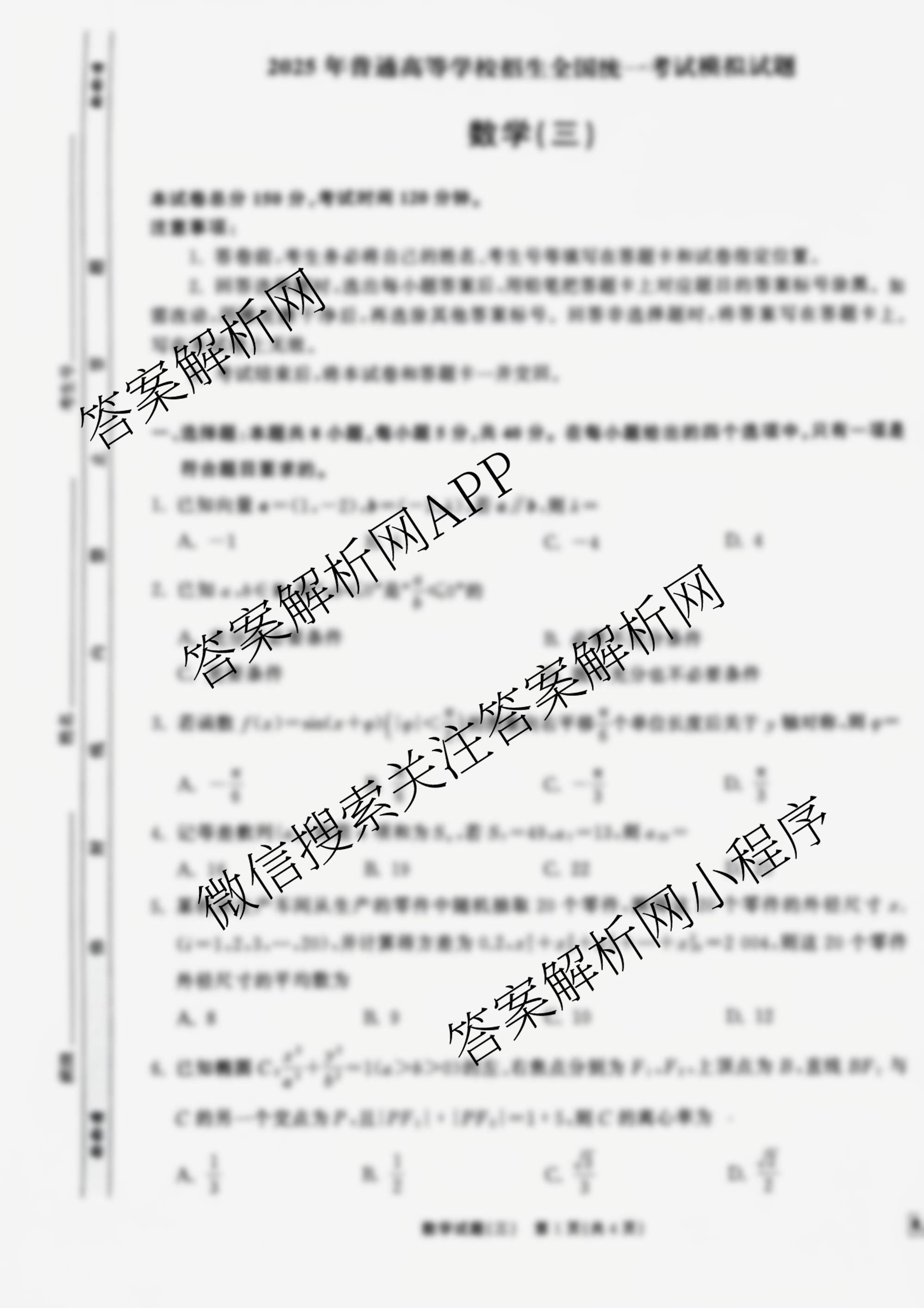 轮轮清·打靶卷·2025年普通高中学业水平选择性考试模拟试题(三)数学试题