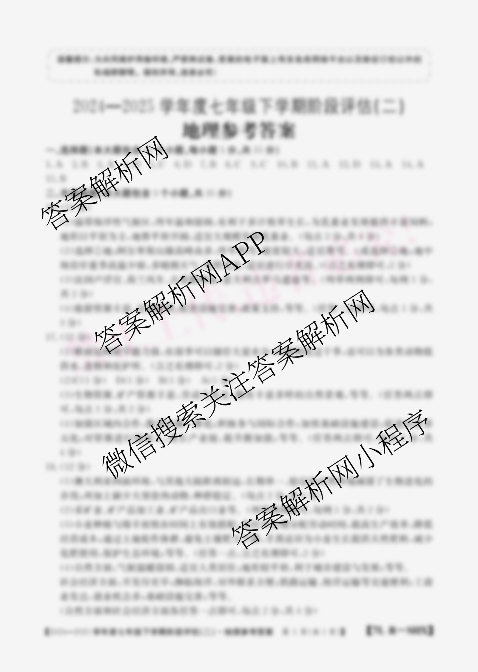 - 2024-2025山西省学年度(七年级)下学期阶段评估(二)[7L-SHX]地理(JJB)答案