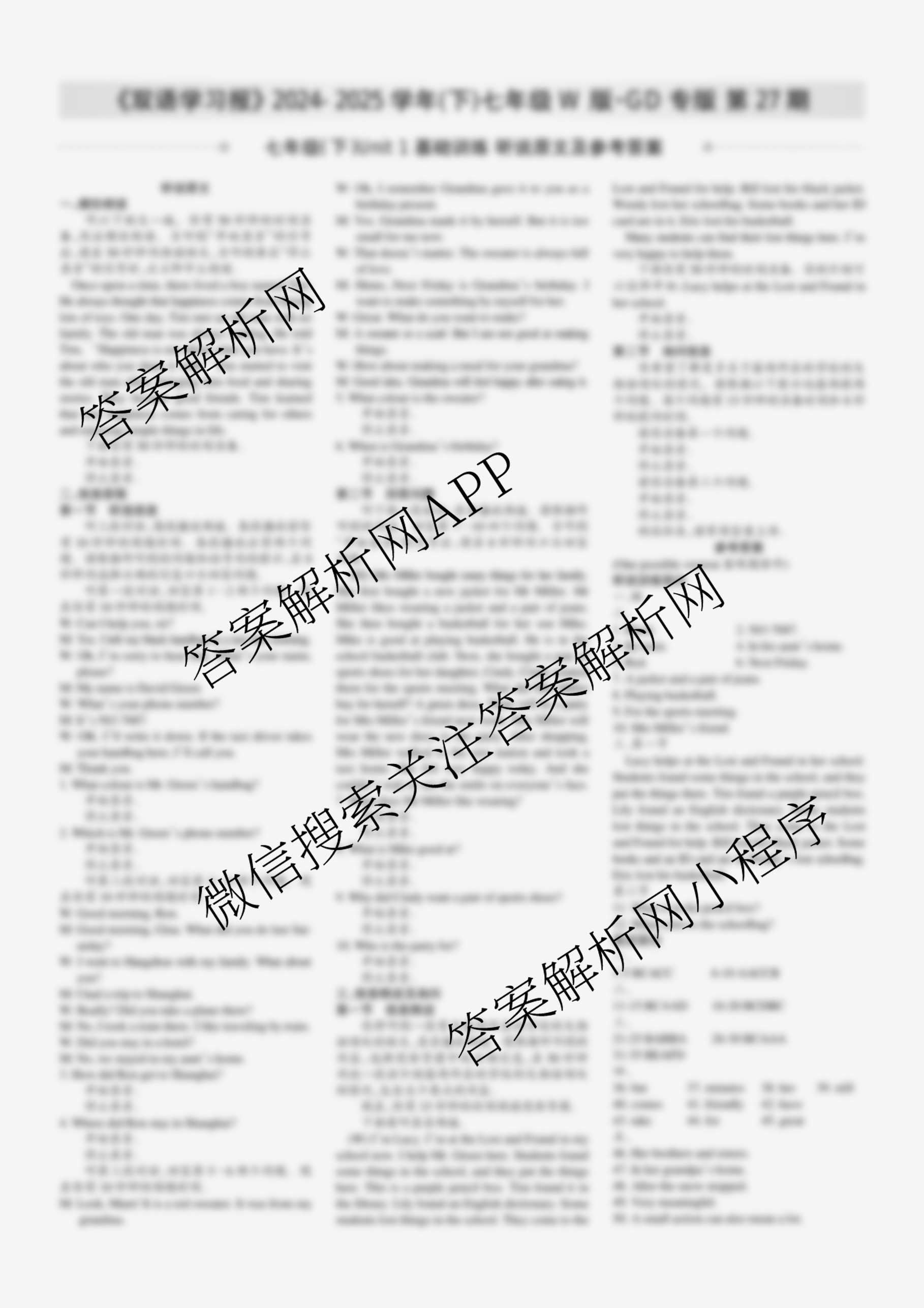 2024-2025学年下学期 双语学习报 七年级 W版GD专版第27期答案