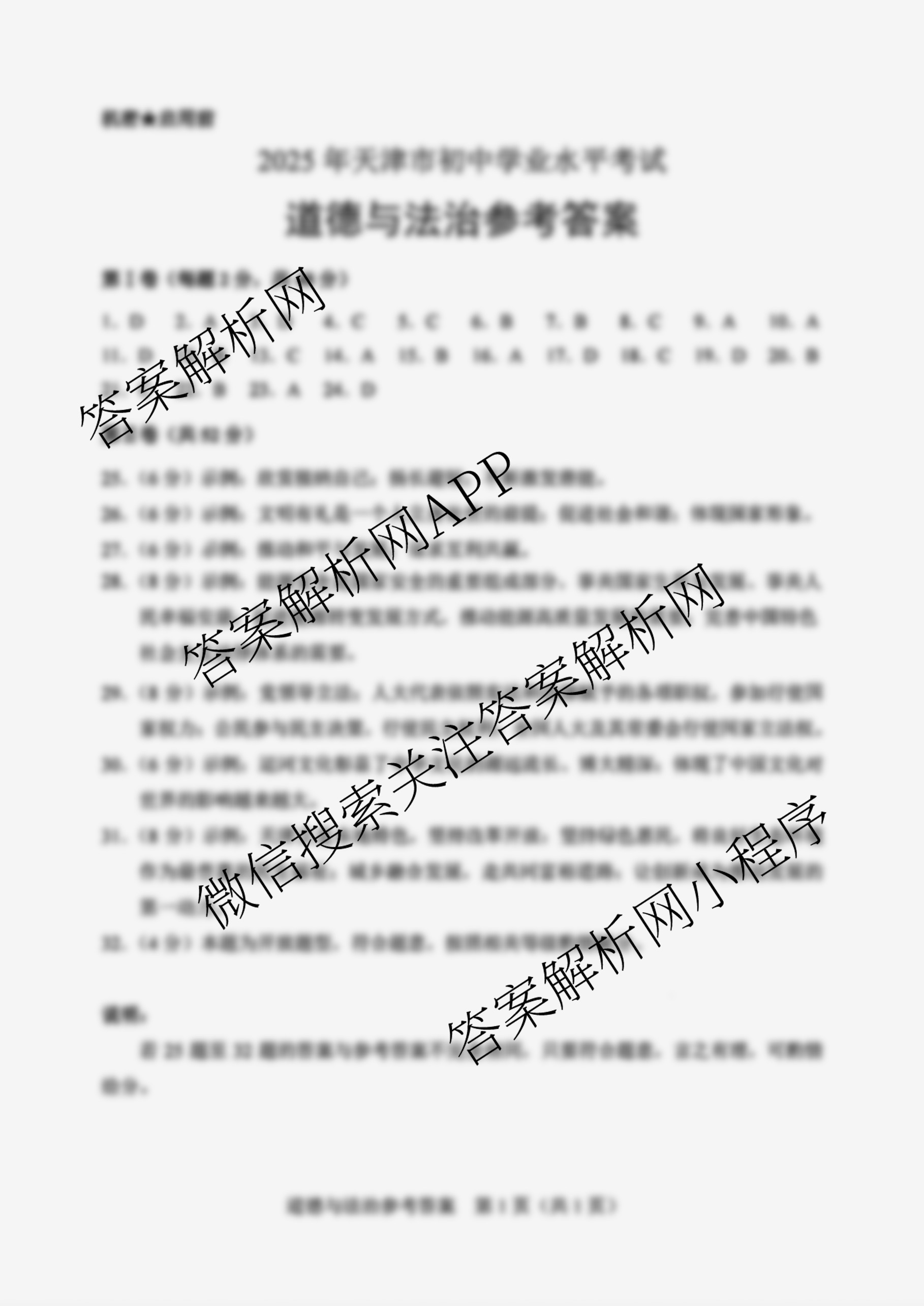 - (九年级)2025年天津市初中学业水平考试道德与法治答案
