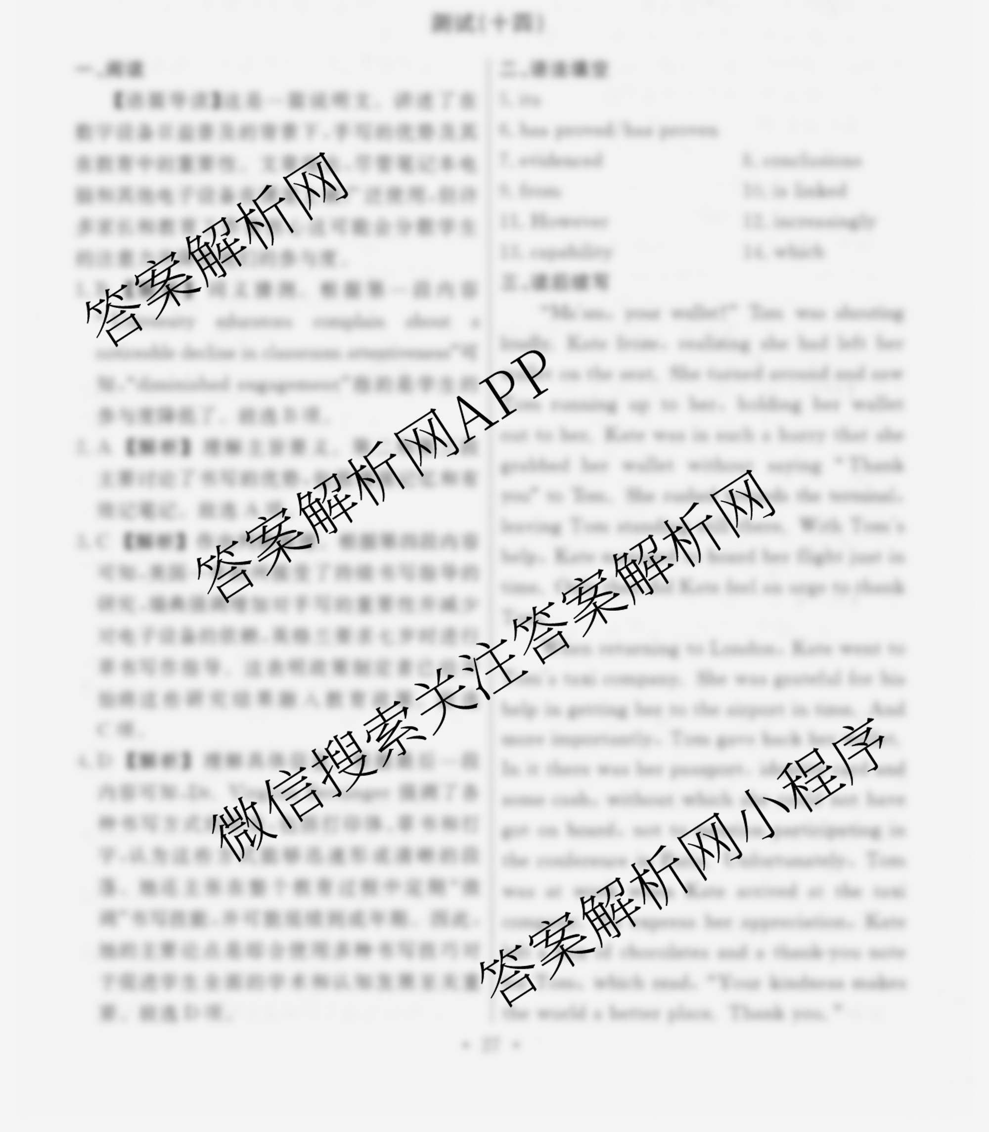 衡水名师卷2025-2026学年度高三一轮复习考点测试卷(十四)14英语(空心菱形)答案