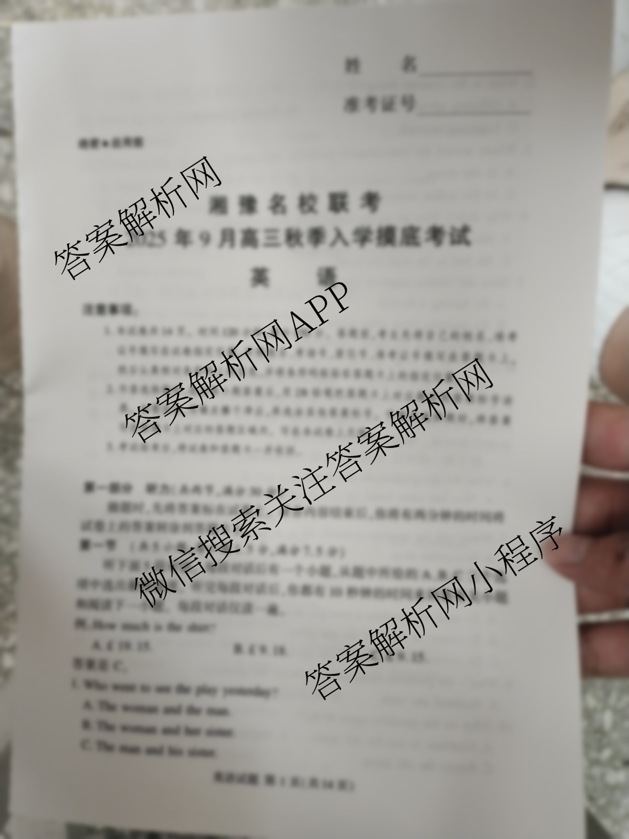 - 高三(湘豫名校联考)2025年9月秋季入学摸底考试英语试题