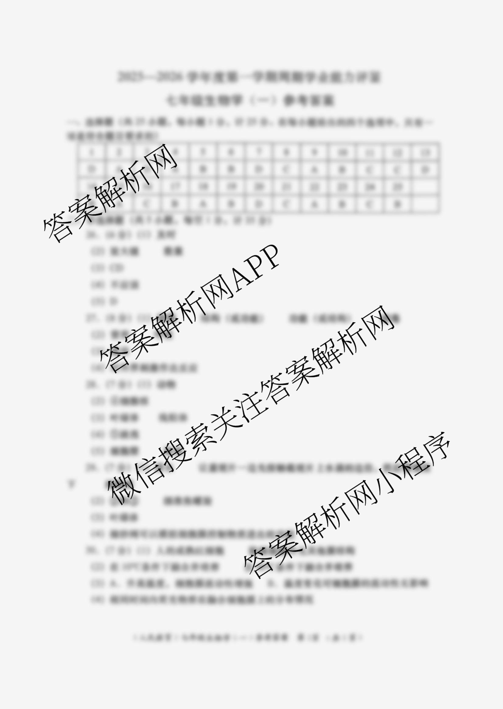 - (七年级)陕西省2025~2026学年度第一学期周期学业能力评鉴(一)生物答案