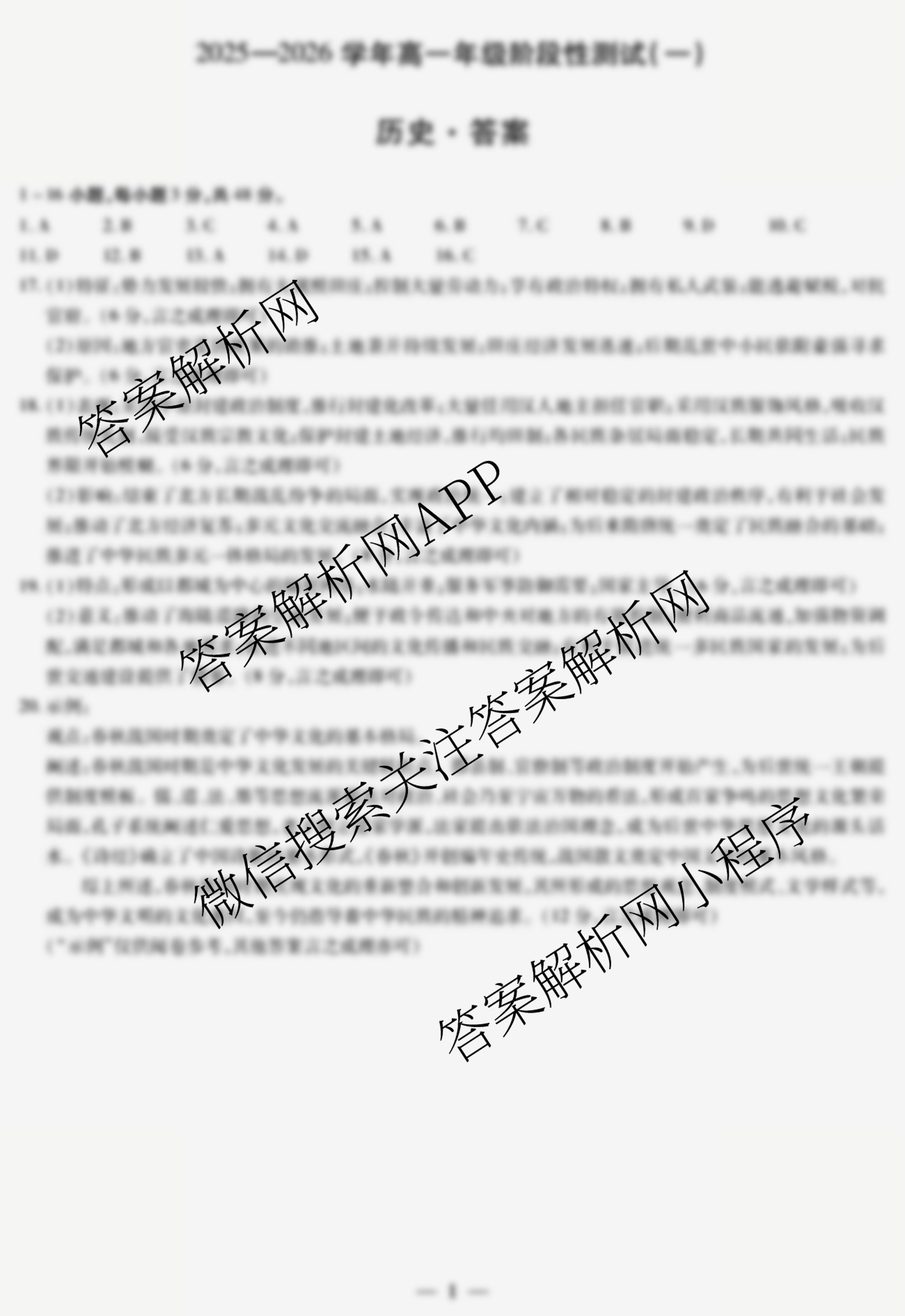 - 2025-2026[天一大联考]学年[高一]年级阶段性测试(一)1历史(专版)答案