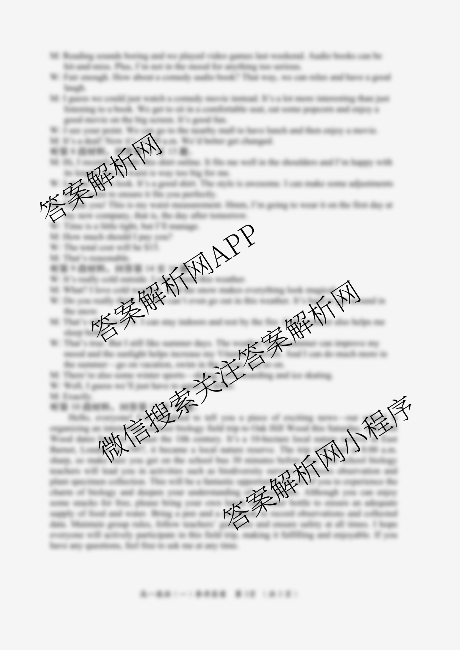 - (高一)2025~2026学年度第一学期(周期学业能力评鉴)(一)英语(人民教育)答案