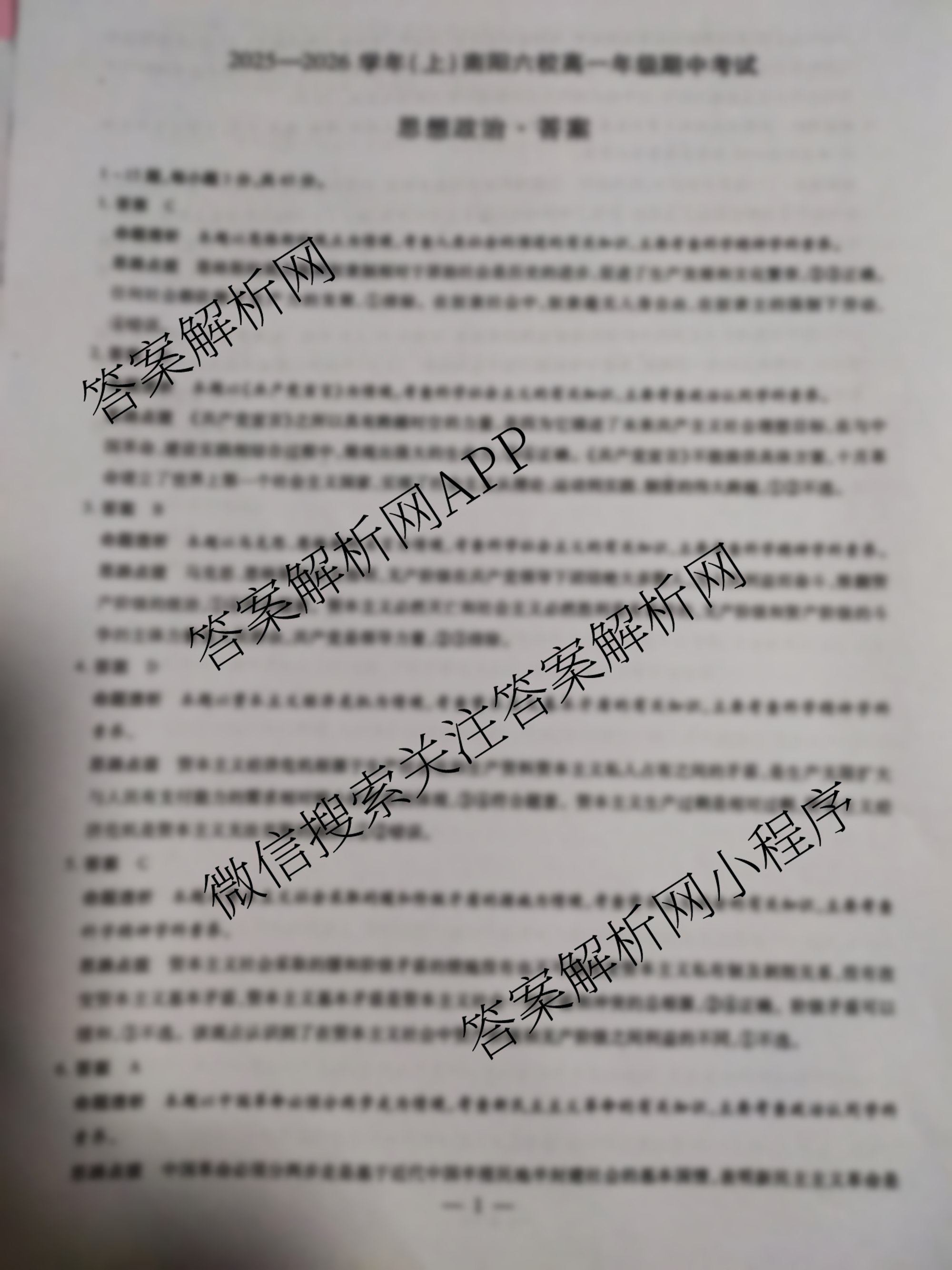 - (天一大联考)2025-2026学年(上)南阳六校(高一)年级期中考试政治答案