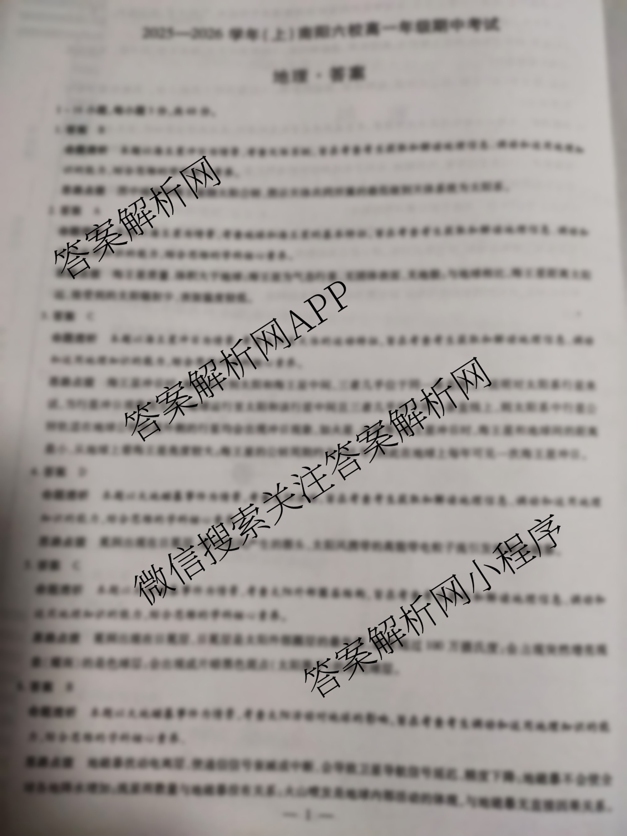 - [天一大联考]2025~2026学年(上)南阳六校(高一)年级期中考试地理答案