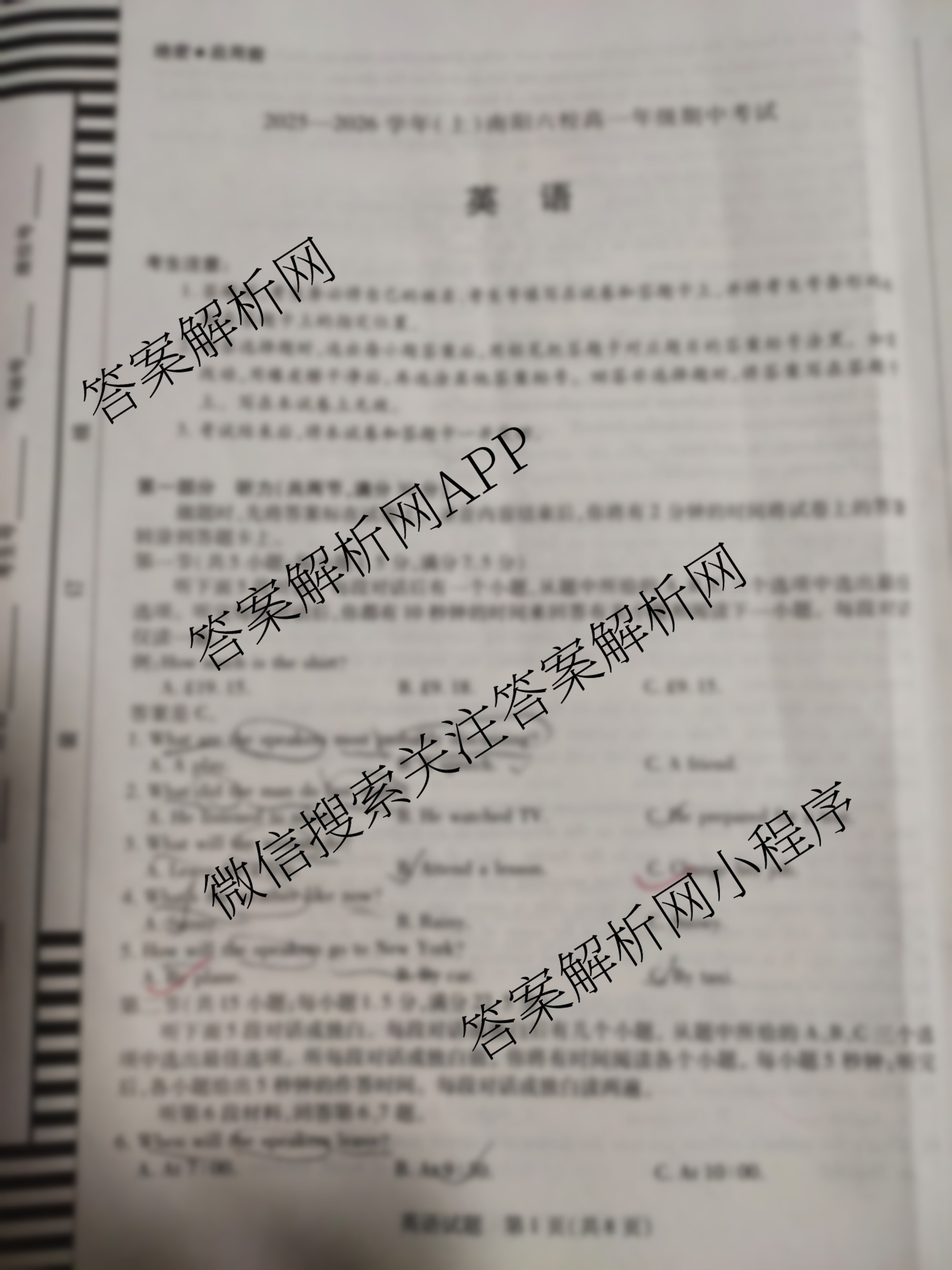 - 2025-2026(高一)(天一大联考)学年(上)南阳六校年级期中考试英语答案