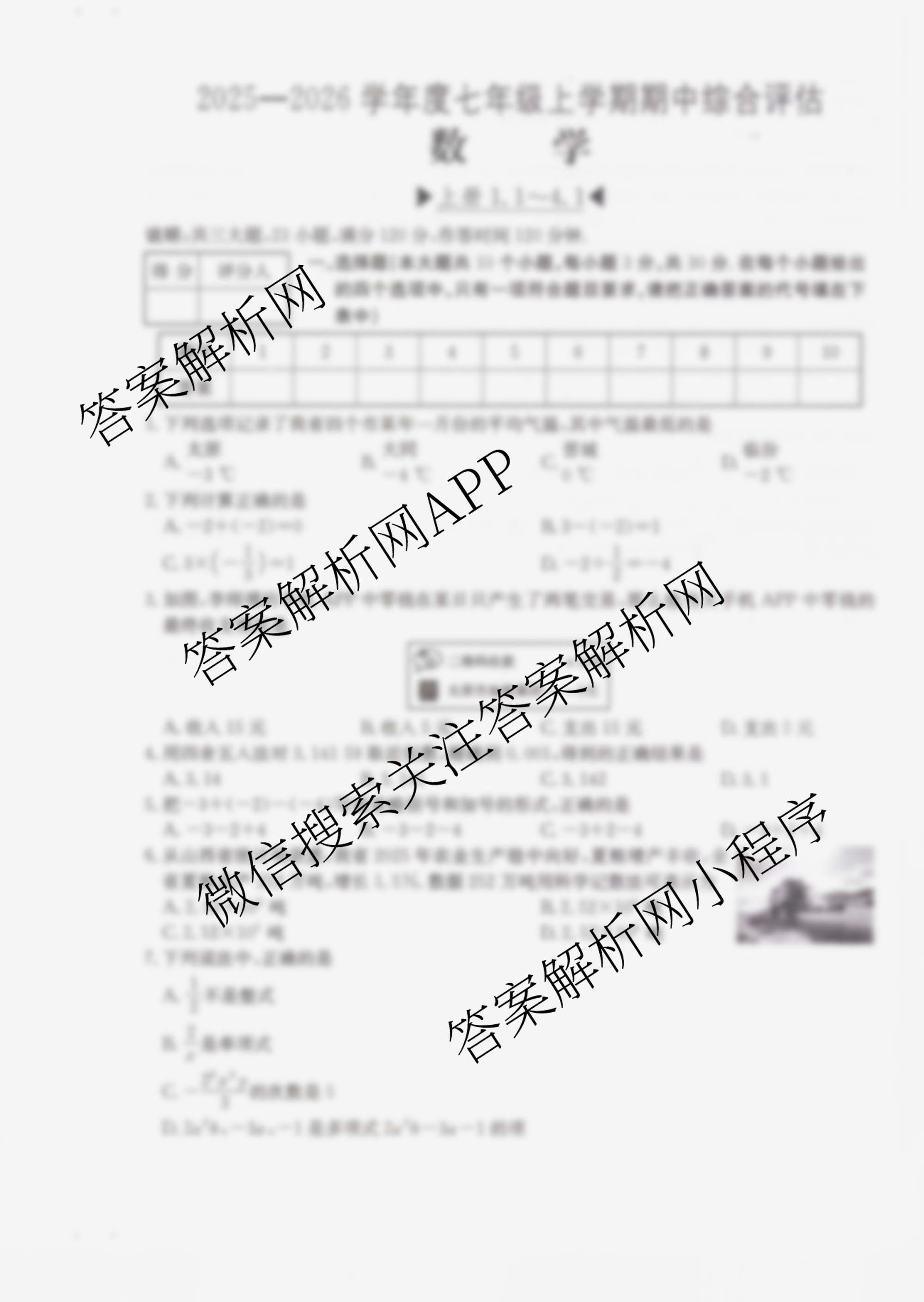 - 七年级山西省2025-2026学年度上学期期中综合评估[2L-SHX]数学(R)答案