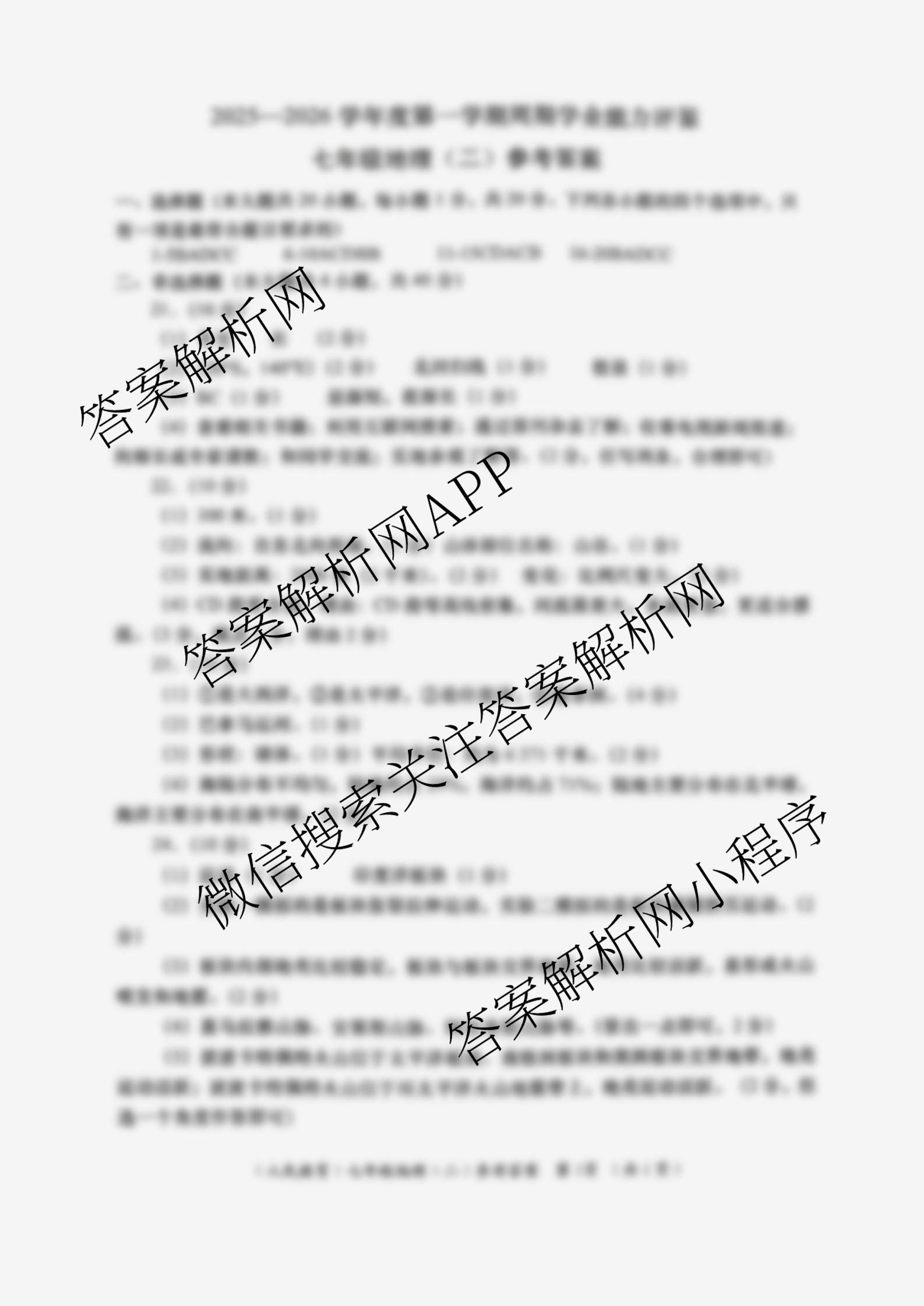 - 2025~2026陕西省学年度第一学期(周期学业能力评鉴)(无字母)(七年级)(二)地理(人民教育)答案