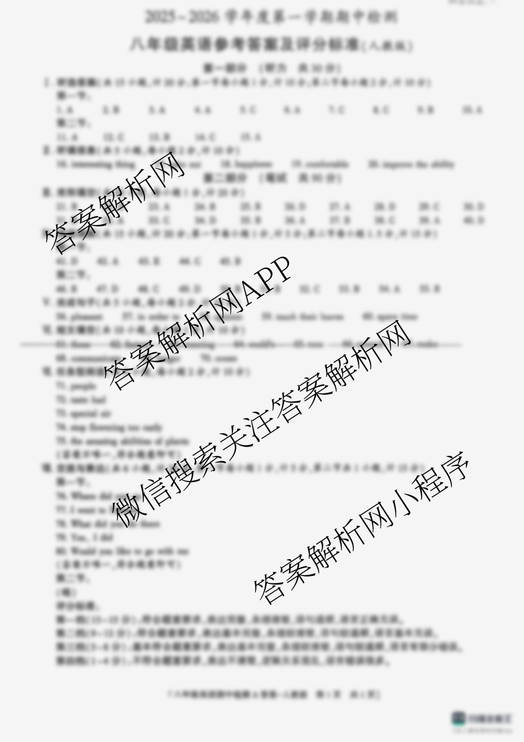 - 2025-2026八年级(益卷) 陕西省学年度第一学期期中教学质量检测 试卷类型:A 英语(人教版)答案