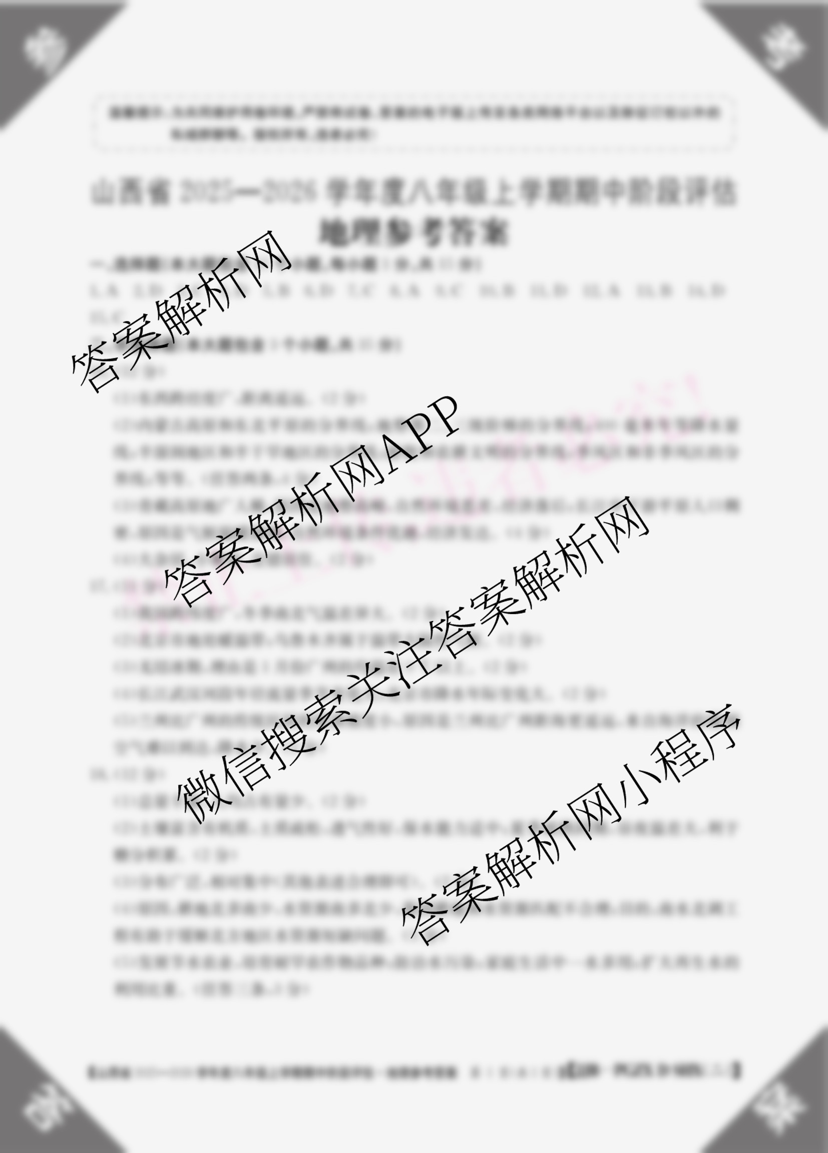 - 2025-2026[八年级]山西省学年度上学期期中阶段评估[PGZX·D·SHX(二)]地理(JJB)答案