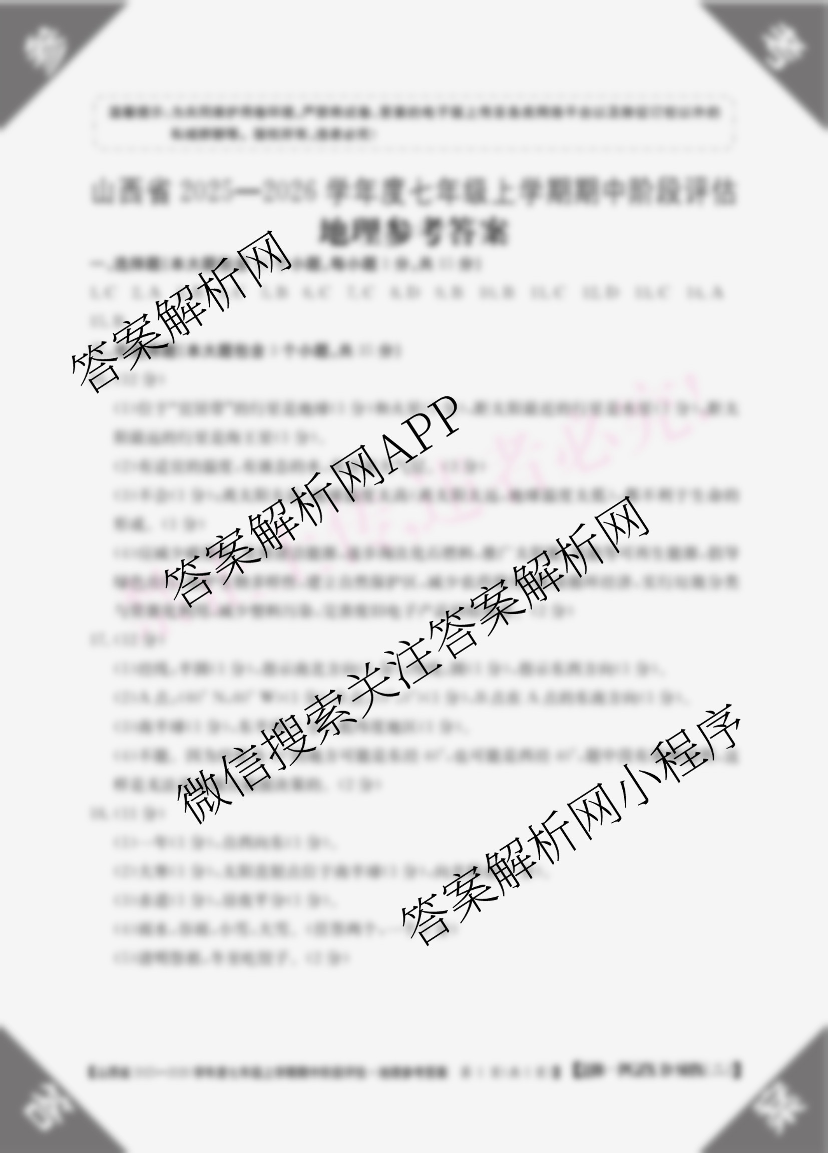 - [七年级]山西省2025-2026学年度上学期期中阶段评估[PGZXDSHX(二)]地理(R)答案