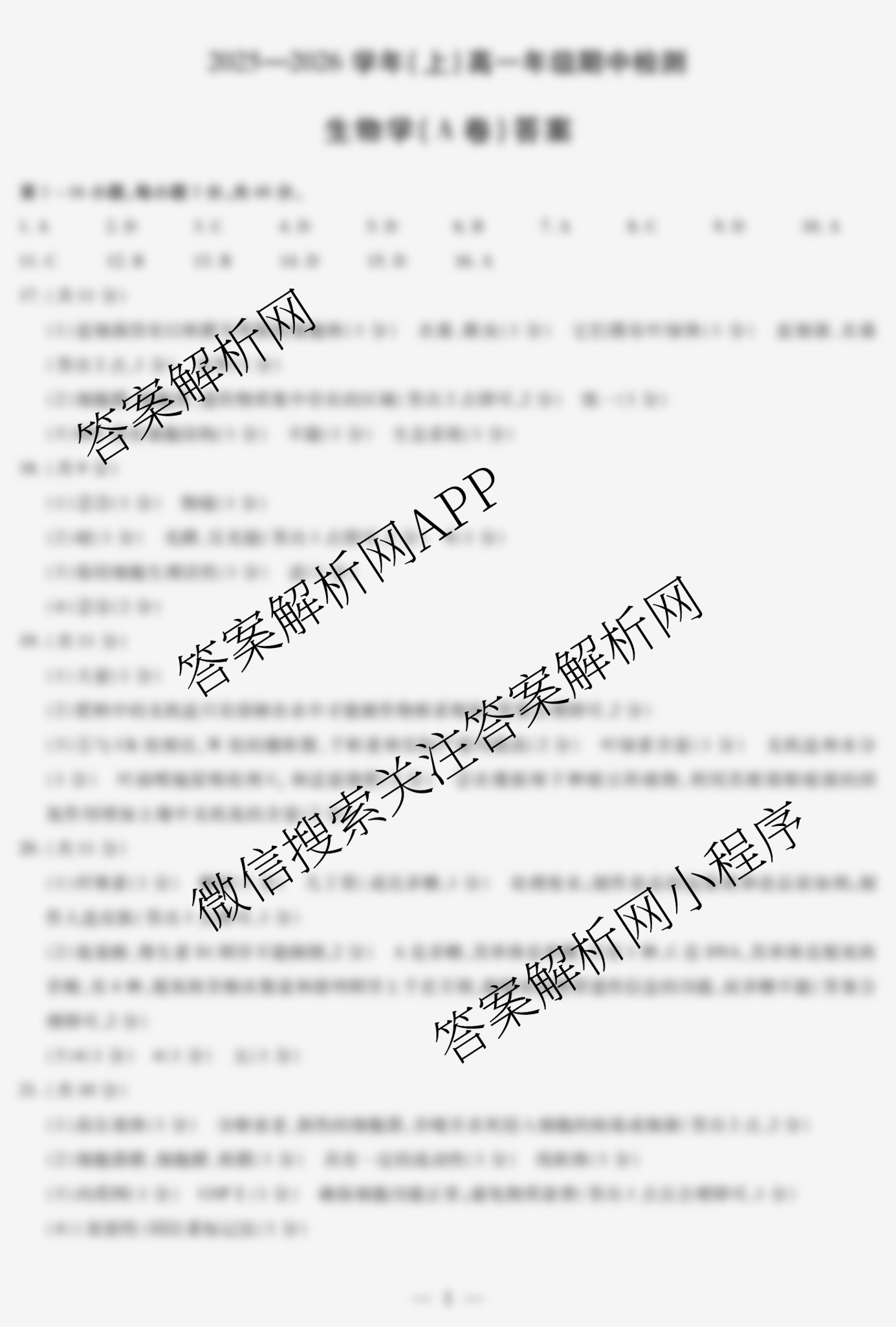 - 2025~2026(高一)天一大联考·河南省学年(上)年级期中检测生物(A卷)答案