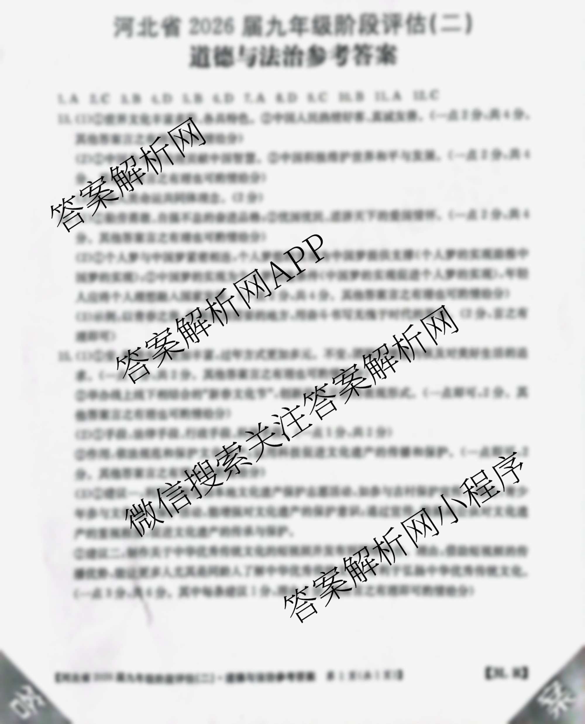- [九年级]河北省2026届阶段评估(二)[3L]道德与法治(R)答案