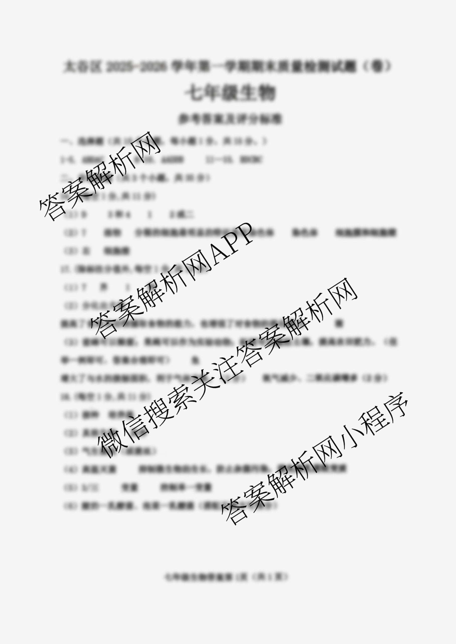 - 2025~2026[七年级]太谷区学年度第一学期期末质量检测试题(卷)生物答案