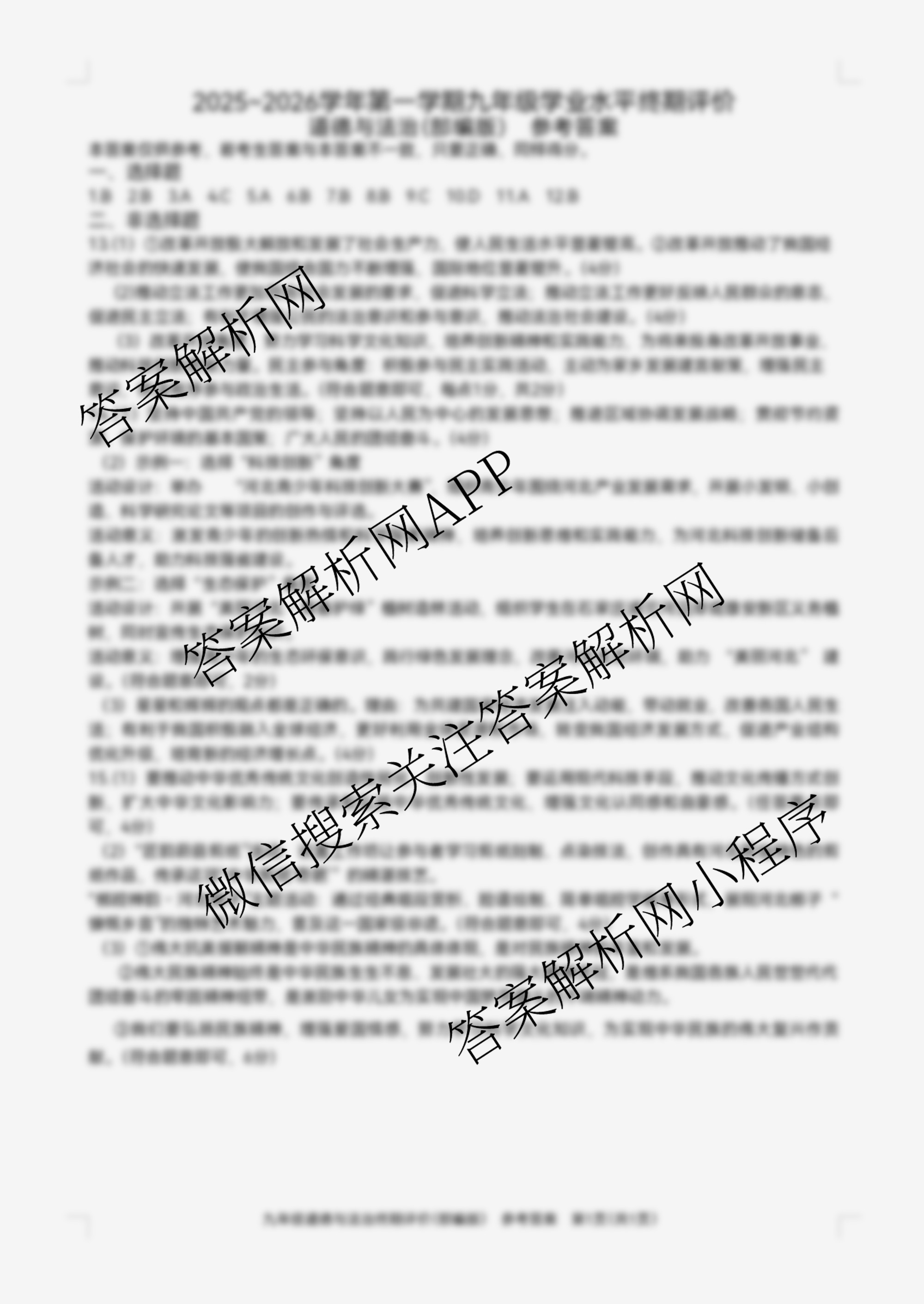 (九年级)河北省2025-2026学年第一学期学业水平终期评价道德与法治(部编版)答案