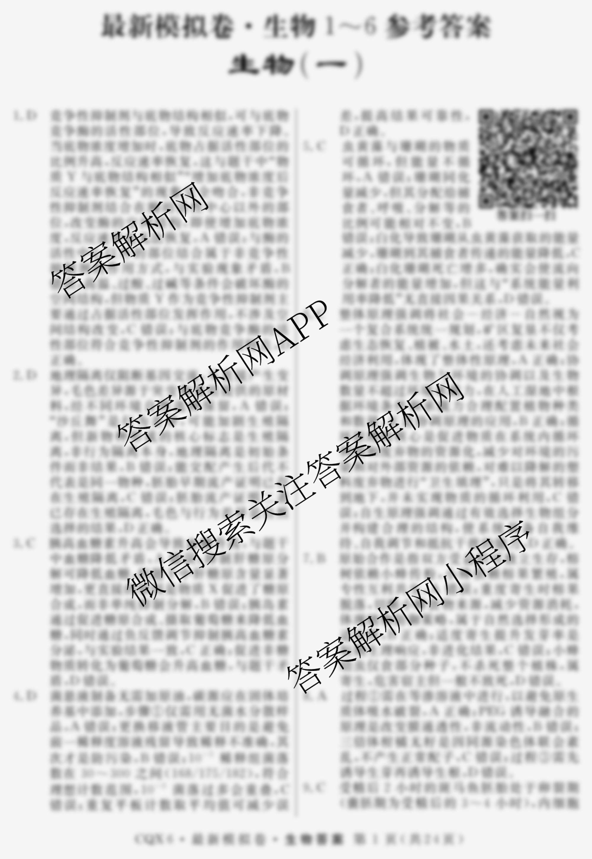 - 2026年普通高等学校招生统一考试最新模拟卷(一)1生物(CQX6)答案